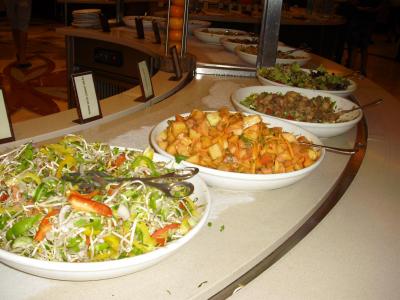 U obědů a večeří každý den brambory,rýže i těstoviny. Výběr z masa taky užasný. Od kuřat, hovězího, jehněčího, ryb až po kachny, křepelky. Vše výborně dochucené. Hamburgry, hod dog. Také mají čokoládovou fontánu. Zelenina snad všechna co vás napadne plus nějaké výhonky a různé namýchané saláty.