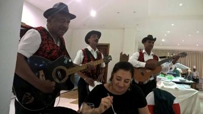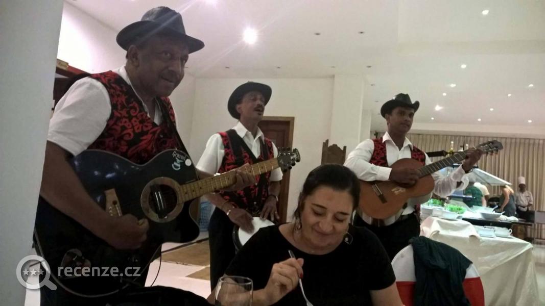 Jídlo bylo chutné, výběr dostačující, aby si každý vybral to svoje. Spousta ovoce a zákusků. U večeře živá hudba.