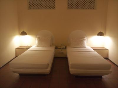 Hotel je v rozlehlé zahradě plné klidu, starých stromů a keřů, jezírek. Uprostřed tropické zahrady jsou bungalovy s terasou. My jsme měli výhled na malé jezírko. Pokoj byl prostorný stejně jako koupelna. Tam nechybělo mýdlo, sprchový gel, tělový krém a koupací čepice. Pokoj měl miniledničku s balenou vodou, set na přípravu kávy a čaje. Líbilo se mi útulné sladění židlí a květináčů z proutí. Trochu negativně bych hodnotila nešikovně veliké průduchy na horní části zdi, a tak jsem ráno slyšela všechny, kdo kolem prošel a povídal si.