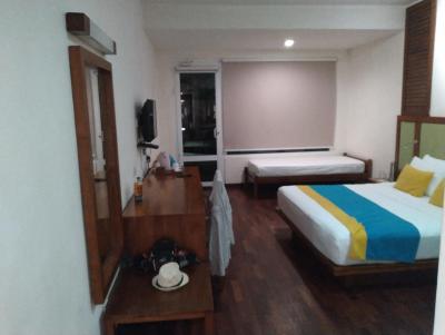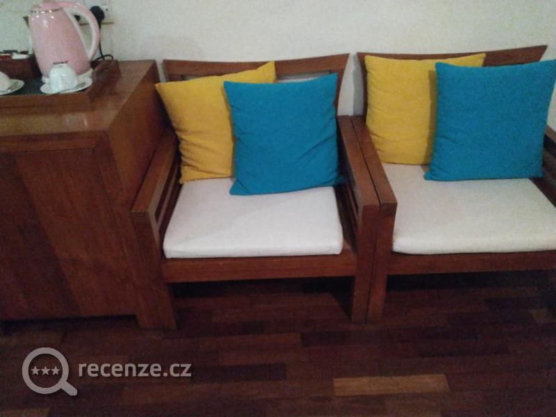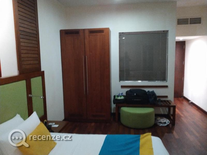 Běžné řešení starších hotelů na pobřeží, dlouhá křídla s téměř shodnými pokoji, zde třípodlažně. Ubytován jsem byl v přízemí, zcela na kraji u hlavní budovy, což mělo za následek trochu větší hlukovou zátěž jak vzhledem k pohybu osob, tak blízkosti centrální klimatizační jednotky. Pokoj ovšem slušných rozměrů, standardní výbava DBL (jednu noc jsme tam měl i přistýlku, poté nahrazena sezením se stolkem), vše čisté, funkční. Dílčí nevýhodou je starší elektroinstalace, na vše jen vypínače s malou kolíbkou a přímo u zdroje /nejde zhasnout naráz vše.../, který se zejména potmě špatně hledá. Jen na venkovní terase byl již nábytek /lehátko s omyvatelným potahem + židle se stolkem/ značně opotřebovaný, až zašlý - sem tam jej užije i místní fauna... Příjemná podlaha, nějaký druh lamina imitujícího prkna, ale nestudila. Ve skříni trezor s jednoduchým ovládáním, denně doplňována pitná voda do termosky, chladná skutečně vydržela dost dlouho. Prostorná koupelna, jen horší řešení sprchové části.