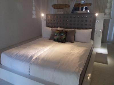 Pokoje vybaveny střídmě designovými kousky. Rodinný pokoj dvě patra a terasa (v hotelu je jen jeden). 6x garden suite a 1x standard room.