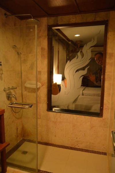Krásné prostorné pokoje v typicky asijském stylu - postele s nebesy, masivní dřevo. Velmi mě zaujala netradičně řešená ložnice, kde bylo průhledné okno do koupelny, konkrétně do sprchy. Na pokoji byla plazmová TV, minilednička, klimatizace i větrák a balkon.