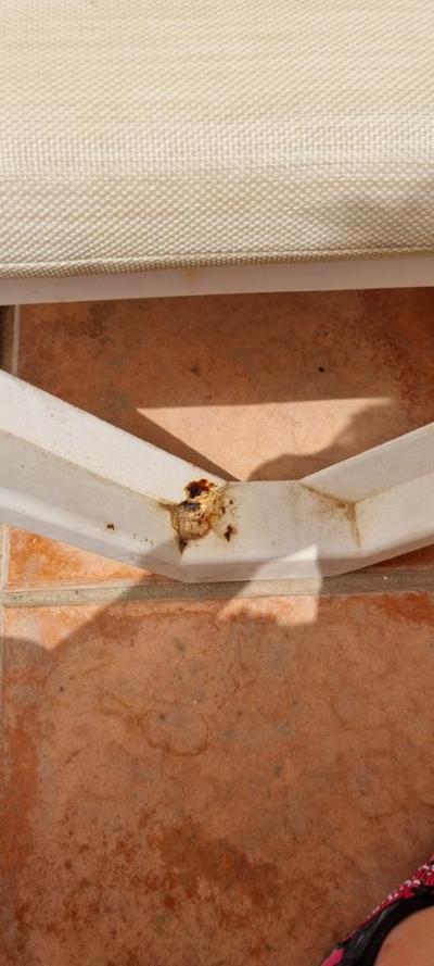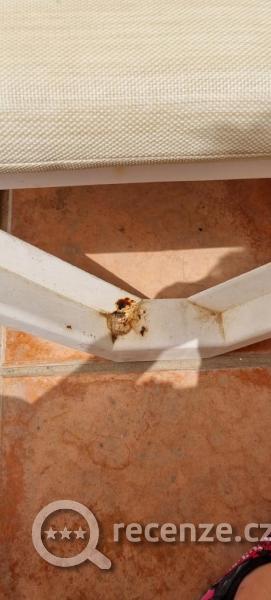 Vybavení hotelu katastrofa. Zapáchající flekate lehatka u bazénu, Všude bordel, rozbité sklenice....
