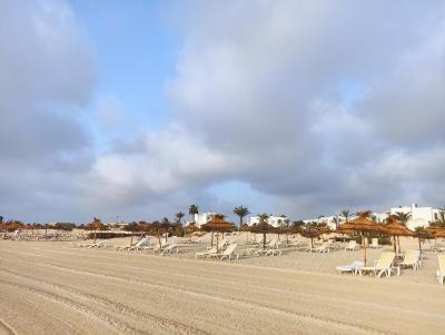 Pláž byla každé ráno uklizená, očištěná od trávy, kterou přinesl večerní příliv. Dostatečně široká, dostatek lehátek i slunečníků. Bary u pláže i u bazénu dostatečně zásobeny. Voda, pivo, tonic atd. vždy k dispozici. Moře bylo opravdu nádherné, během dne měnilo barvu od jemné modrozelené až po večerní temně modrou. S přílivem připlouvala i tráva a vlny vířily písek, stále ale bylo krásné. I moře je příroda, nikdo nemůže čekat, že bude stále vypadat jako obří bazén. Na pláži nabídka projížďky na velbloudech i na koních. K večeru volně pobíhali i místní psi, kteří se přes den drželi mimo pláž.