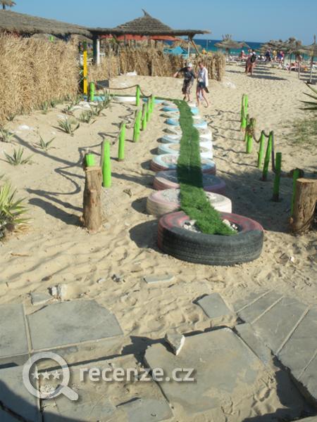 Pláž přes rušnou ulici, vstupuje se na ni po pneumatikách. Moře čisté, ale personál pláže mezi hosty pouští svoje kamarády obchodníky.