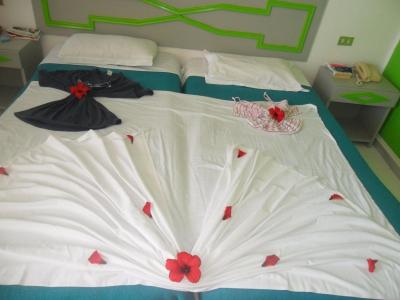 Zdálo se mi, že jsme měly snad nejlepší pokoj. Pokoj na patro, 2 manželské postele. 2 záchody, jeden nahoře i dole. Klimatize, všechno funkční. Měnit jsme nemusely.