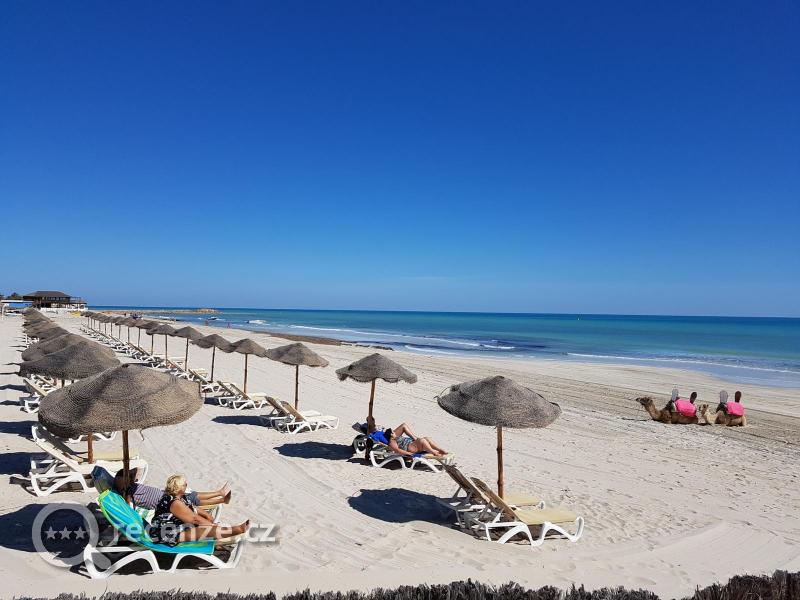 Rozlehlá, překrásná, dobře udržovaná písečná pláž u hotelu, s pozvolným vstupem do azurově průzračného moře. Lehátka, slunečníky a osušky zdarma, v místě bar a sprchy.