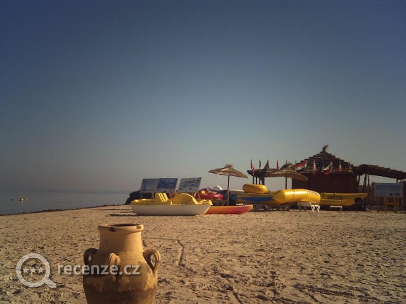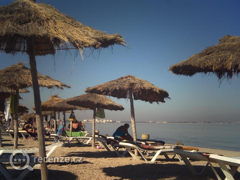 Pláž je skutečně velmi blízko, přímo u zahrady hotelu, je docela malá, ale v říjnu bylo lehátek dostatek. Jsou zdarma, ale za matraci chtějí 2 dináry na den.Pláž je plná vyplavených rostlin, které však každý den uklízejí na nedalekou skládku. Moře je mělké do vzdálenosti cca 50 m, pak už jsou bojky a hustý porost trávy a vodních řas. Hloubka moře max 1m. Vlny žádné. V moři plave občas kdeco, od odpadků, části oděvů až po PET lahve.