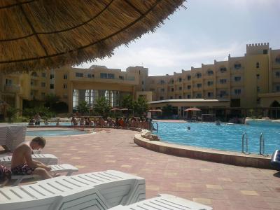 Hotel je krásný, velký, pokoje jsou čisté, světlé s velkými balkony. Výhled buď na moře s bazénem nebo na frekventovanou 3 prodovou silnici, železniční trat a odletovou dráhu letiště Monastir, a solná jezírka mezi tím. Hluk ale v pokojích byl snesitelný V jezírkách se rodí stovky much, které vám budou otravovat pobyt, a to všude. Jak pravila naše dcera po návratu domů: "jéé já jsem odehnala mouchu, a ona se nevrátila".To se vám v tomto hotelu nepodaří.