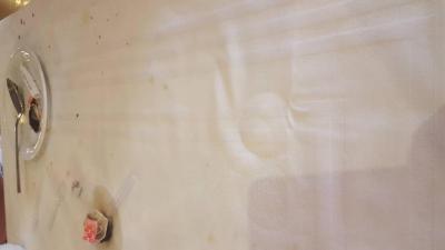 Jídelna - špinavé ubrusy se pouze otáčely, na podlaze zbytky jídla a bordel.