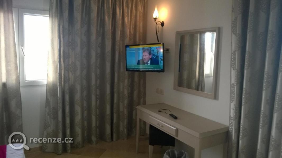 Co se týče pokoje, tak relativně nová koupelna, postel, lcd televize. Hotel celkově spíše starší. Personál ok, v restauraci si samozřejmě můžete "předplatit" lepší místa, číšník vám je po předchozím podarování pár dinárů rezervuje pro příště, ale pořád jim dávat nějaký ten dinár se celkem prodraží. Jedna se o místa u klimatizace a číšník za vámi pravidelně chodí a dolívá nápoje. Wifi v lobby. Co se týče výletů, my jsme přes cestovku využili jen cesty do Zoo (show s delfíny, lachtany...), jinak se vyplatí jet na výlety s místním prodejcem na hotelové pláži, má nebo měl tam stánek, můžete s ním taky smlouvat, vyjde to levněji než přes cestovku.