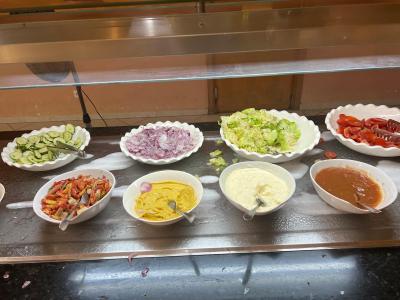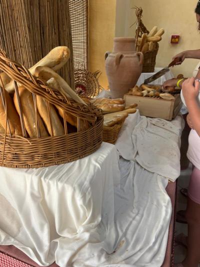 Obědy a večeře ok, jen všude dlouhé fronty a pití do miniskleniček. Snídaně katastrofa, jeden druh slaného pečiva - bageta, kterou při krájení ohmatá polovina hotelu. Také mi vadilo kouření během obědů a večeří ve venkovní části.