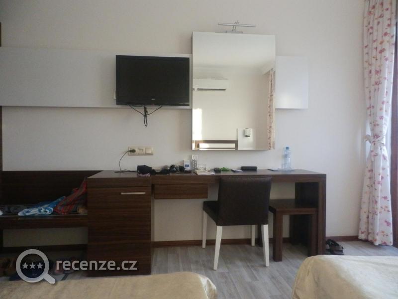 nejprve nás ubytovali na pokoj č. 102 v prvním patře. Teda málem mě trefilo, sice pokoj hezký, prostorný, ale balkon pod úrovní jakési střechy, na kterou nebylo problém se dostat, balkonové dveře nešly zavřít. Ihned jsem šla na recepci, že v tomto pokoji teda nebudeme ani za nic. Bez nějakých okolků nám pokoj ihned vyměnili za pokoj v 6. patře. Vyměněný pokoj byl stejně zařízený, pěkný, prostorný. Denně uklizeno, navoněno. Jen ty balkonové dveře nešly zavřít, ale v 6. patře je to jedno. Údajně teda zavřít šly, ale vícero nás na to nedošlo jak, i když nám to delegátka na schůzce vysvětlovala.