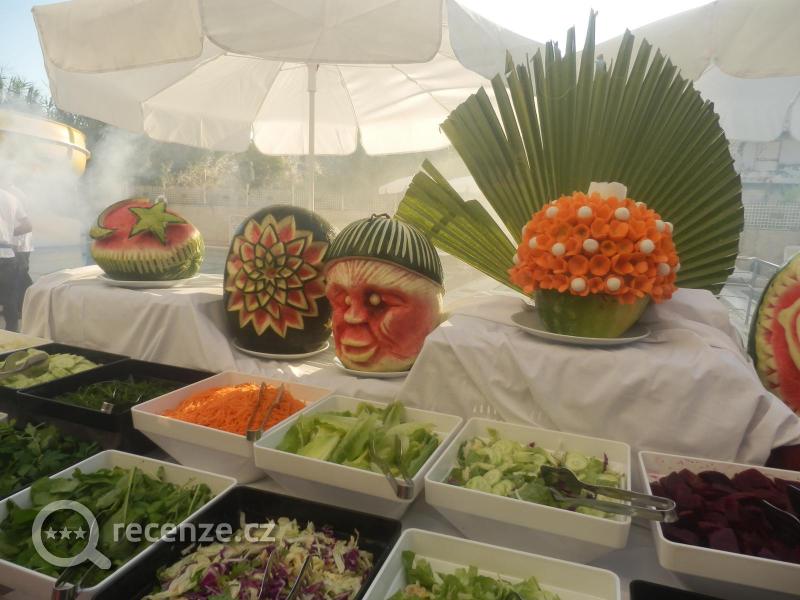 Oběd, večeře : dva druhy polévky, někdy jedna - výborné. Rýže, brambory, hranolky, různé směsy s masem a zeleninou. Někdy ryba, játra. Toto bylo slabší než na jiných hotelech. U bazénu denně smažili na večeři nějaké maso, kuřecí gyros,... Jinak zákusků velký výběr, zmrzlina v pátek - Turecký večer /vynikající/. Vadili nám velké řady na večeři a začátkem července, kdy se hotel naplnil vícero hosty, nedostatečná kapacita míst.