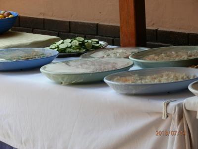Jídelní lístek jsme ani neviděli. Možná ho teprve tvořili. Každou chvíli jim nápoje došly - nebyla cola, pak nebylo víno. Vše se dováželo. Na jídlo jsme čekali v řadě s talíři a příbory v ruce, dokud nezazvoní na zvoneček. Přijít později, moc Vám toho nezbyde. Přibalte si Endiaron nebo něco, co zklidní Vás žaludek a něco na zklidnění nervů.