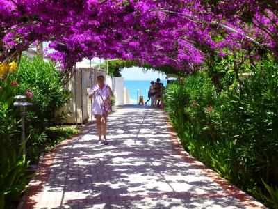 Z hotel.areálu je to velmi krátká a příjemná procházka po chodníku lemovaném květinami.Na pláži bylo sice plno ale my jsme chodili jenom v plavkách od bazénu,vykoupali jsme se v čistém a teplém moři.Při vstupu na pláž je hotelový bar s pitím a ovocem,které Vás přijemně osvěží.Na pláži nabízí vodní sporty,cenově levnější než v Chorvatsku.