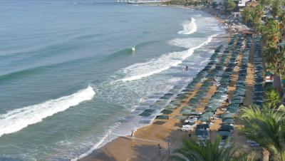 Výhodou hotelu je písečná pláž, která je přímo u hotelu. Slunečníky a lehátka v rámci All zadarmo. Během našeho pobytu moře mělo vice dnů s větším množstvím vln, ale dalo se po překonaní hranice cca 15 m plavat i ležet na nafukovacím lehátku. Asi čtyři dny kdy bylo klidnější. Vstup do vody pozvolný, tedy vhodný i pro pobyt s malými dětmi.