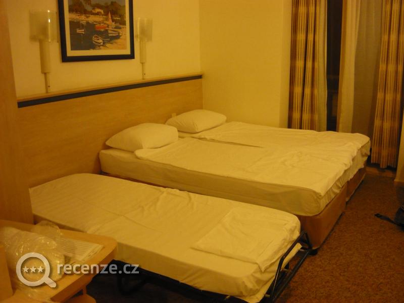 přijeli jsme na hotel ve 21 hod, šli jsme se ubytovat, dva dospělí a jedno dítě které už mělo 14 a platilo skoro celou cenu, jsme dostali dvoulůžkový pokoj 3x4 metry. Když jsme se šli zeptat na recepci, prý nám dají přistýlku. Přinesli rozkládací železnou palandu, na ní tvrdou matraci a rozložili ji k jedné skříni která byla v pokoji. Když jsme se ptali pokojského jak tam budeme chodit, pokrčil rameny, tak jsme si sami celý pokoj přestavěli, ale stejně se tam nedalo hnout a pro tři lidi jedna skříň ve které byla lednička, 9 ramínek a jen tři malé poličky, no hrůza. Hlavní dveře nedoléhaly a proto byla celou noc slyšet auta, protože za hotelem byla silnice.