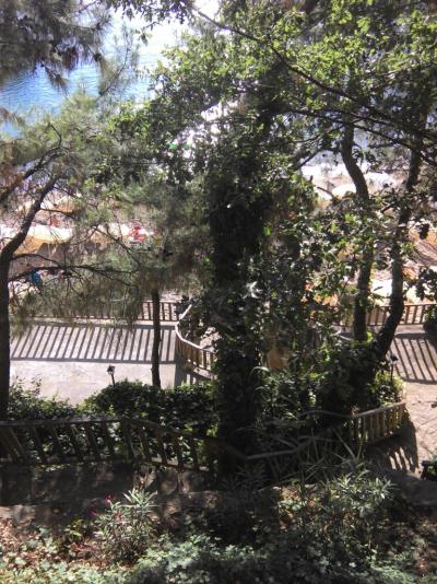 pláž písková a postačující s pozvolným vstupem do moře,betonová terasa obkolesená rúznými kaskádami s lehátkami,slunečníkem a malým stolečkem(většinou pro pár)a překrásnou přírodou.Cesta na pláž byla jak rájská záhrada spojená s botanickou záhradou,takú krásu jsme nezažili na žádném hotelu.Lehátka,slunečníky a osušky zdarma.Osušky měnili obden.Další pláž byla veliká ,písková na kterou se šlo přes druhý hotel nebo po hlavní ceste ,ale nám se líbila táto menší
