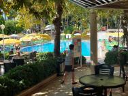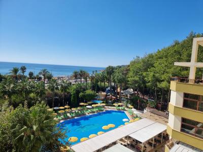 Pokoj zaplacený bez výhledu na moře, tudíž jsme počítali, že budeme ve druhé – zadní budově, ale dostali jsme pokoj v hlavní budově, ve 4. patře s bočním výhledem (tudíž na silnici, hotel Pegasos Royal a kus moře). Za nás spokojenost. Byli jsme 3 dospělí, pokoj 2+ 1. Zde jsme ocenili přistýlku formou normální postele, neboť syn má již 182 cm. Za doplatek 120 euro nám nabídli rodinný pokoj, ale v druhém patře bez výhledu, velký hluk, což jsme odmítli. V pokoji vše fungovalo, lednice, klima, jen nebyly k dispozici žádné ručníky a kosmetika (naštěstí jsme měli svoji). Nahlásili jsme na recepci a do hodiny přinesli 2 ručníky . Úklid zběžný, vynesli koše, ustlali postel, občas vyměnili ručníky. Taková klasika.