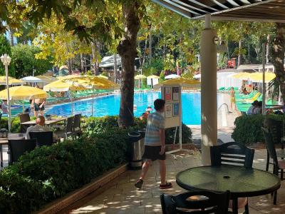 Asi největší zklamání. Zde je vidět velké šetření. Posledních 10 let jsme u moře 2x až 3x do roka a toto jsme ještě nikde nezažili. Celý týden z ovoce na výběr pouze jablko červené, jablko zelené a občas i pomeranč. Těšila jsem se na melouny, smůla… Vyhlášené výborné turecké dortíky, žádné. Celý týden na výběr pouze baklava a pudinkovoželatinové v různých barvách, občas řídký čokoládový puding v alobalové misce. Snídaně celkem ok až na máslo, které se Vám nalepí na patro a máte tam povlak celé dopoledne, to se fakt nedalo, jinak klasika. Obědy a večeře za nás opět zklamání. Za celý týden pouze 1x grilované kuřecí stehenní maso a jednou jako hovězí tenoulinké plátky, 2x ryba – hořká, nedala se jíst, jinak mleté kuličky, mleté čtverečky, mletá kolečka, smažené nugety a 1 nebo 2 druhy kuřecího a mletého v zelenině s bramborami plavající v nějaké neochucené šťávě. Pití z automatu cola, fanta, spite klasika místní, dalo se, káva z automatu, kde neustále chyběla smetana a nikdo ji nedoplnil a ani na baru neměli normální mléko, takže většinou pouze černá. Míchané drinky – dva jsme zkusili i je dopili, ale znovu už si nedali . Pivo ale bylo prý celkem pitelné. Víno nevím, neměli jsme. Co nám hodně vadilo, že personál, který byl v malém počtu, neodklízel špinavé nádobí, nebylo kam si sednout. Jeden den dokonce ve vnitřní jídelně byly všechny stoly plné špinavého nádobí (snad i od minulého dne), že nebylo možné žádný využít. Občas nebyly talíře či příbory, ale po urgenci u personálu je nakonec přinesli. Tyto služby byly tedy opravdu na hraně. Obsluha bez úsměvu, otrávená, na mobilu (tak to jsme zatím také ještě nezažili). Nechápu tento laxní přístup vedení hotelu.