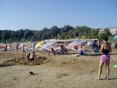 K moři podchodem,asi 100 m,čistý,udržovaný!Moře samý písek,příjemné vlny,pozvolný vstup..lehátka celkem držela.Slunečníky?jakási celta nad několika lehátky.Bohužel hned vedle veřejné pláže,oddělené páskou která ležela na zemi.Všude domorodci,vedle,ale i před "hotelovou pláží" takže do moře se derete přes deštníčky domorodců,pod kterým je naskládaná celá familie na židličkách,s vařičem a celý den dělají jakýsi piknik.V moři hlava na hlavě právě díky domácím a všude turečtí lovci se svým..kak tibja zavůd :-)