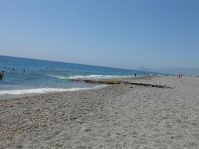 Širší pláž jsme ještě neviděli :) Na pláži jemné kamínky. Každý den pláž upravena a uválcována, dostatek lehátek pro všechny návštěvníky hotelu, lehátka vždy vyčištěna. Z pokoje jsme se na pláž dostali asi za 4 minuty podchodem pod místní komunikací. Komunikace vůbec neruší. Moře mělo 27 stupňů, voda průzračná, první 3 dny větší vlny potom moře úplně klidné. Vstup do moře je pozvolný.