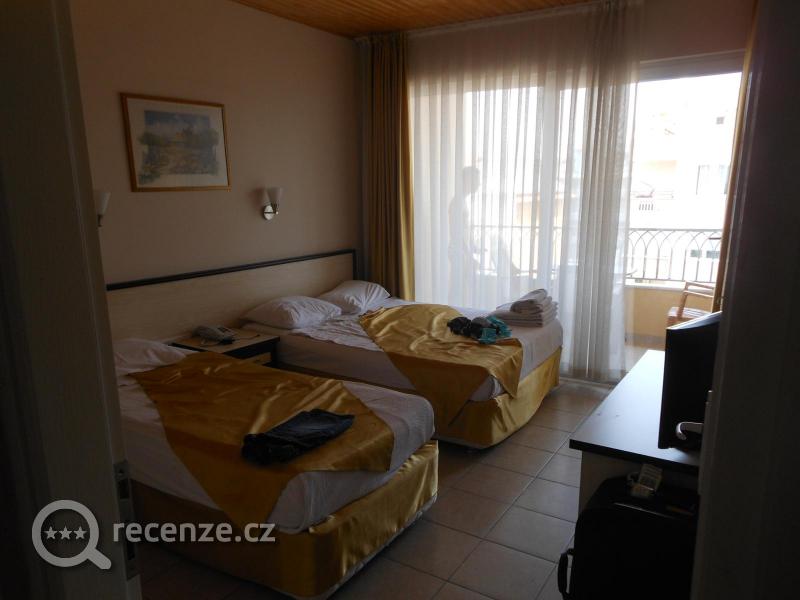 Co do výbavy měl pokoj koupelnu s WC a sprchovým koutem, dvě ložnice, v obou byla jedna normální a jedna manželská postel, TV, stolek se šuplíkem. Obě ložnice mají vlastní klimatizaci. Byly zde dvě skříně, jedna v předsíni, druhá v jedné z ložnic. Každá ložnice měla vlastní balkon s částečným výhledem na moře, na obou balkonech stolek s popelníkem, tři plastové židle a nástěnný tříramenný sušák na prádlo. Balkony byly situovány do poměrně rušné ulice, kde přímo naproti byla restaurace kde hrála nepřetržitě nějaká hudba, pod hotelem také restaurace s hudbou, ale to je v centru letoviska řekl bych normální. S úderem půlnoci přestala hudba ve všech restauracích vyhrávat - zřejmě nějaký místní předpis. Spát se dalo v pohodě, zejména díky únavě z opravdu velkého horka a také občasné únavě z alkoholu zdarma v rámci All Inclusive :)