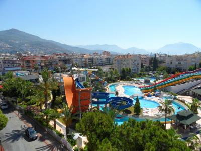 Jak už jsme uváděl výše, tak z restaurace, které je v pátém patře je krásný výhled do okolí. Je to díky tomu, že je vedle hotelu akvapark a ne jiný hotel, který by bránil ve výhledu. Součástí hotelu je krámek s oblečením, kadeřnictví a v dané ulici je několik obchůdku. Celé město je čisté a nikde se nepovaluje žádné smetí. Prakticky za rohem je promenáda plná laviček, fontán, dětských hřišť, posilovacích strojů. Na útesu je hrad a z něj krásný výhled na celé město. Z pláže je přístupná krápníková jeskyně, která je v útesu pod hradem a na druhé straně je přístav plný barů a diskoték. Je zde přístupný maják, ze kterého lze pořídit krásné fotky na celý přístav a několikrát zmíněný hrad – v noci je přístav plný neónů všech možných barev. Dále zde uvidíte loděnice vytesané do skály a „červenou“ věž. Město je plné minaretů a hlásí se z nich 5x za den. Zajímavostí je, že když se hlásí z minaretu, tak se v restauracích, barech a na diskotékách vypne hudba. Nikoho jsme ale neviděli modlit se. Jeden číšník se přiznal, že se modlí jen jednou a to v pátek. I zde je tedy vidět velký rozdíl mezi Tureckem a Egyptem s Tuniskem. Nikdo Vás tu neobtěžuje, nikdo není vlezlý. Všichni jsou přátelští.