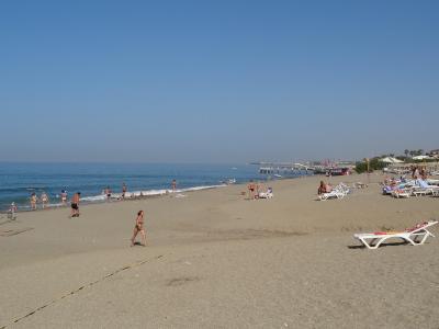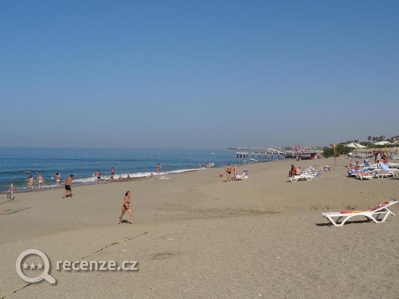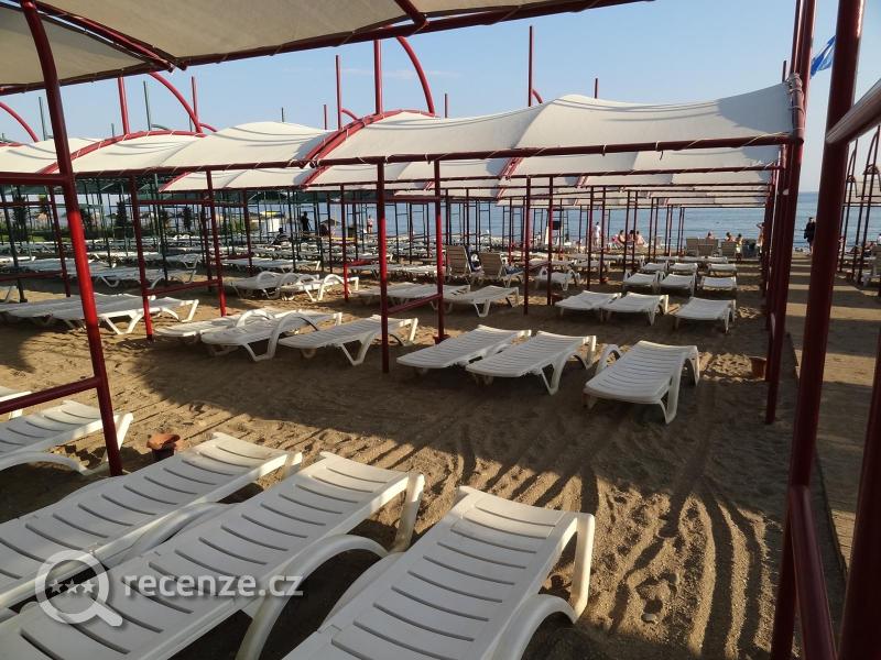 Trochu masovka, ;-) alespoň pro toho, kdo se ležet ve stínu. Lehátek ale bylo dostatek, pouze tradiční věc, ráno si nosili lidé ručníky a zabrali si lehátka to se týkalo jak bazénů, tak pláže. Půjčení matrace u moř 1,- EUR. Na pláži hrubší písek, postupně kamínky. Cca 5-7m od moře byli větší kameny a pak byl písek. Do moře přístup také z mola po schůdcích nebo skočit. ;-)