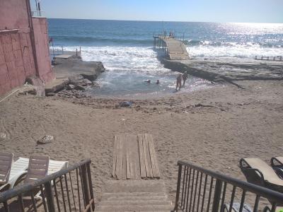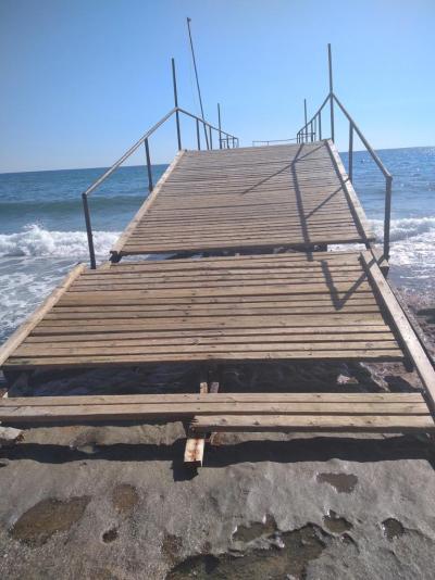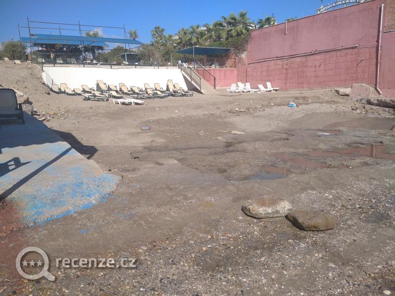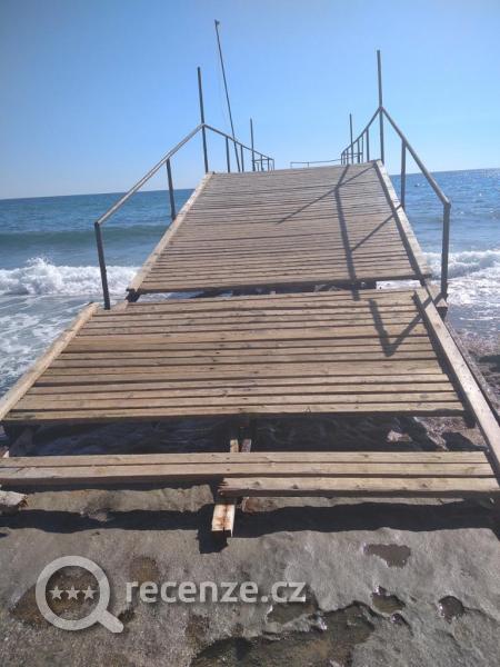Katastrofa!!! Hotel měl mít vlastní pláž se slunečnikama, lehatkama a barem. To vše bylo asi z doby, kdy hotel vznikl. Jak v zaplivane hospodě asi V. cenové skupiny. Všude, bordel. V baru pouze 2 druhý džusu, když nedošlo, tak i pivo bylo, střídavě hranolky hamburgery, meloun. Lehátka humus, špinavé, potrhané, stolecky to samé. Pláž mrňava, nejhorší ze všech. Do moře přístup hrůza, z jedné strany betonové molo, z druhé strany kameny, hned u břehu placaté klouzavé kameny. Když přijde vlna, může vás pěkně narazit na obě strany. Nedá se vůbec koupat, jen sedět na kraji. Slunečníky nejsou, pouze celé zástěny nad lehatkama. Mate- li vůbec odvahu na to humusni lehátko lehnout. Jo a na molo vůbec nelezte!! Konstrukce prorezavela, prkna se hloupou. Chodily jsme na jiné pláže.