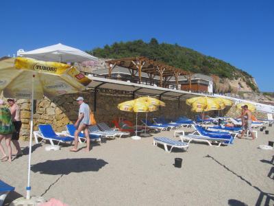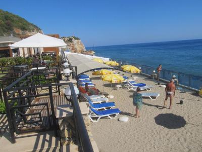 Tak to je opravdu bolavé místo. Těžko se popisuje vlastně třípatrový pobyt u moře - přízemí=moře, 1.patro=pláž, 2.patro=plážový bar. Na pláž se projde tunelem pod silnicí, o to nic. Ale jelikož přímo u moře není dost místa, je vše usazeno na skále nad vodou. Nejdřív tak přijdete k plážovému baru, z něho po schodech sejdete na plácek s pískem a lehátky nazývané pláží a z "pláže" pak po dalších schodech nebo spíše snad žebříku se sleze do vody. A to přímo na balvany, ze kterých prostě skočíte do vody. Rozhodně nic pro děti. Anebo se můžete po těch balvanech dopravit o kousek dál na písčitou pláž, která ovšem nepatří hotelu. Na tuto pláž se dá jít i přes území dalšího hotelu, pokud vás tam však ostraha pustí. Nás nepustila ani s malým dítětem na ruce a odkázala nás na vstup do moře náležející našemu hotelu. Jinak moře je blizoučko, je krásné, teplé a čisté a zkrátka si musíte poradit.