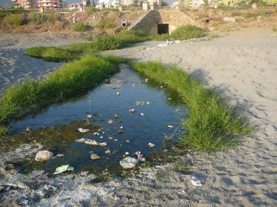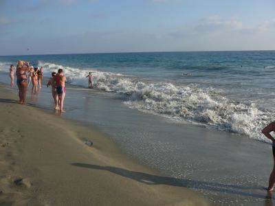 Vzdálenost souhlasí s nabídkami, ale to je všechno. Přístup pod dálnicí je nízká, špinavá díra, kterou zároveň odtékají jakési splašky z města. Pláž plná vajglů, papírků a jiného svinstva, písčitá, lehátka hotelu mají rozedrané potahy a slunečníky. Vstup do moře je přes kamennou hranu, o kterou vás příboj dokáže dost pocuchat. Pro děti a starší osoby velice nebezpečné.
