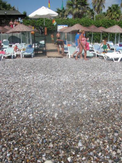 pláž oblázková, vhodné boty do vody, moře čisté,teplé, vlny