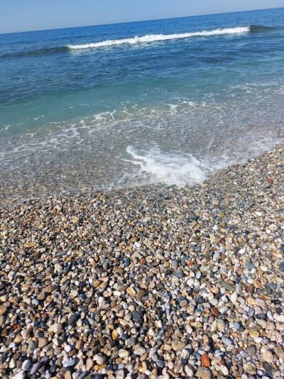 Hotel má skvělou polohu - projdete zahradou a jste na pláži. Lehátka s ochranou před sluncem v dostatečném množství gratis, osušky na kauci. Vstup do vody jsou oblé kamínky, chce to raději vodní boty.