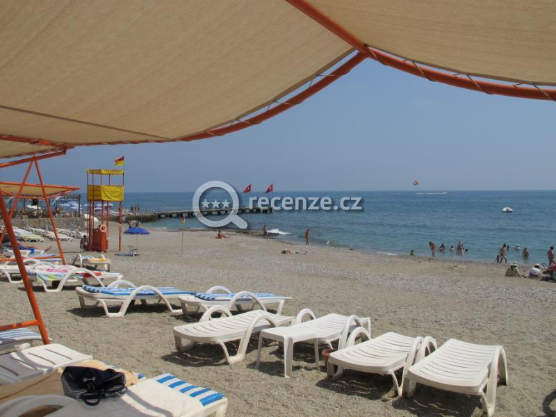 Pláž veliká písek a oblázky, dostatek lehátek, ale za výměnu osušek se platí 2 eura.