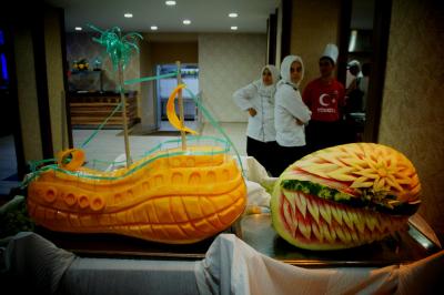 Spousta salátů, příloh, dezertů- hlavně pudinkových, ale pro nás málo masa (většinou kuřecí). Každý den byla i ryba, která měla milión kostí. V úterky jsme narazili na kebab, který připravoval kuchař venku. Pití dobré a výběr nealko i alko, všude dokonce automaty na kafe.
