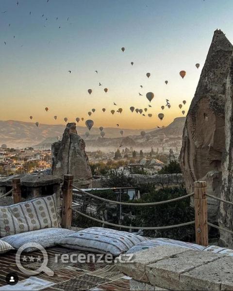 Hotel přímo ve skalách. Je hodně naturální, přesto má skoro každý pokoj vanu s vířivkou a ranní výhled z terasy na létající balony je splněný sen.