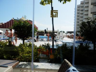 Pláž je podľa mňa pre klienta ďaleko. Hotel stojí priamo pri ceste, takže najskôr prejdete cez cestu na druhú stranu (cez prechody pre chodcov) a potom pokračujete akousi poľnou cestou k pláži. Je to zhruba 300 metrov. Táto cesta vedie popri hotelovom komplexe a z druhej strany je veľká prázdna lúka. Samozrejme obďaleč uvidíte mega veľké komplexy známych hotelov v Lare. Samotná pláž je veľká, piesočnatá s vlastným barom, kde sa môžete aj najesť. Lehátka, slnečníky a matrace sú bezplatne a osušky za depozit. V čase nášho pobytu sa práve budovali chodníky k pláži.