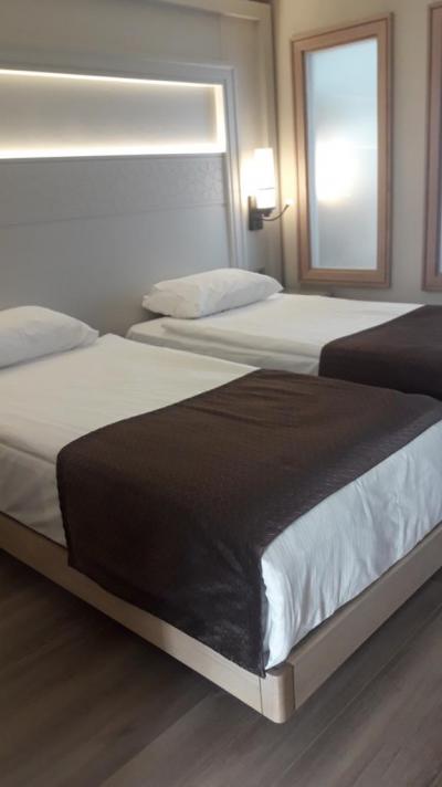 Hotel je rozdělený na 5 bloků, hůře se zde orientuje. My byli ubytováni v rodinném pokoji Deluxe Garden v přízemí, který měl dva pokoje rozdělené dveřmi. Postel byla pohodlná, pokoj čistý a celkem prostorný. Pokoj měl vlastní koupelnu se sprchovým koutem, fén, klimatizaci, telefon, minibar, rychlovarnou konvici, čajový a kávový servis, trezor, Tv, plovoucí podlahu a terasu. Wifi je zdarma.