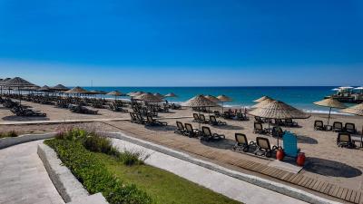 Písečná pláž je soukromá a má pozvolný vstup do moře. Lehátka, slunečníky a osušky jsou v ceně.