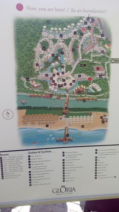 Gloria resort je zložený z troch hotelov - Gloria Golf - zameraný na rodiny s deťmi, Gloria Verde - zameraný na starších alebo rodiny s malými deťmi a Gloria Serenity - hotel s vysokým štandardom. Všetky tieto tri hotely sú prepojené a pravidelne v resorte premáva vláčik. Klienti môžu využívať navzájom služby a pláž akurát za jedlo platia s 50% zľavou.