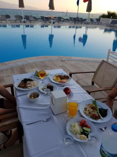 Moře čisté, přístup je možný bez bot do vody, hrubší písek s oblázky. Teplota vzhledem k tomu že se jedná o Egejské moře byla na červenec nižší - 25°C, což je méně než jsme očekávali. Ve stejnou dobu na jihu Turecka 27-28°C. Slunečníky i lehátka v dostatečném množství, osušky možno měnit každý den přímo na pláži, vše zdarma.