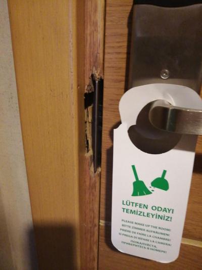 Okopané zdi, vykoplé dveře ne jen v našem pokoji, který jsme první den měli.
