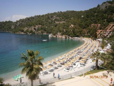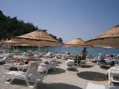 Pláž je ocenená modrou vlajkou za čistotu. Slnečníky a lehátka sú zdarma. Jedna pláž sa nachádza priamo u spa centra a je tu zakázané používať mobilné telefóny a púšťať si hudbu. Ďalšia je centrálna a tá je určiná na hlučnú zábavu. Tiež je k dispozícií ešte aj tretia pláž, na ktorú premáva loďka, ktorá je klientom k dispozícií.