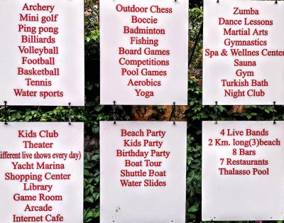 Je tu toľko rôznych aktivít že je zbytočné o nich písať ,dám to sem všetko na jedno foto. Od rána do večera sa viete zapojiť do desiatok činnosti alebo keď chcete nerobte nič len relaxujte a zaplavte si v nadherne čistom tyrkysovom mori. Su tu tri hlavné pláže ,všetky sú skvelé vybavené všetkým čo hostia potrebujú .hlavne jedlom 12 hodín a nápojmi. To isté sa deje aj okolo čistých bazénov .zábava a relax.sluzhy na vysokej úrovni, personál fantázia.