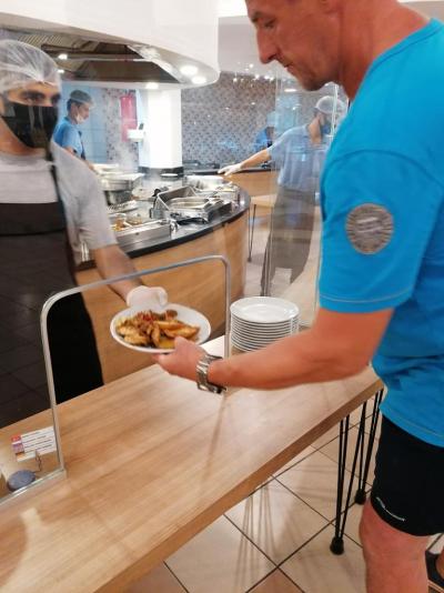 Jídlo, cestovka vám v pohodě prodá All Inclusive, všechno formou bufetu, a nechá si za to řádně zaplatit a vy pak čumíte jak puk. Jídlo je za plexisklem, vůbec s e k němu nedostanete, výběr mizerný na ***** hotel. Stojíte frontu jak ve školní jídelně a ukazujete jak dement přes sklo, co chcete dát na talíř. A ten je vám pak vydám okénkem. A pak jdete do další fronty kde stojíte na saláty, pokud v ní teda vydržíte, máte salát, pokud ne, nemáte nic, protože stojíte, stojíte a obsluha nikde, tak to vzdáte.