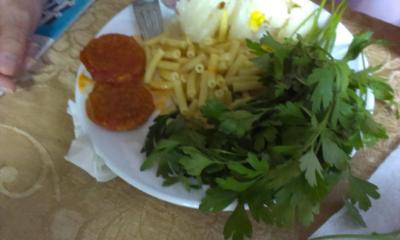 Personál chodil s vozíkom s dvomi veľkými plastovými vedrami popri stoloch, zbierali špinavý riad a do vedier odpadky. Plastové poháre umývali v malej nádobe pri pulte s nápojmi. Reštaurácia bola stoly a stoličky okolo bazéna.