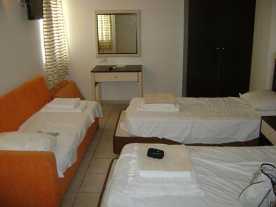 Dostali jsme pokoj ve čtvrtém patře, ve kterém jsme měli tři postele, televizi, fén a klimatizaci a celkově dostatečný prostor. Balkon jsme neměli, ale za to jsme měli z terasy, která byla hned u dveří, hezký výhled na hory a do uličky vedoucí do centra zábavy.