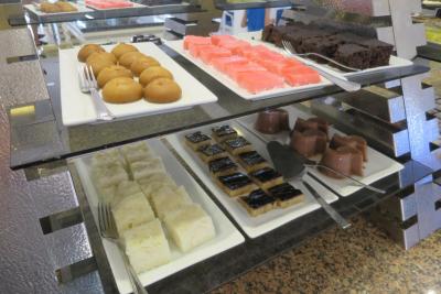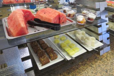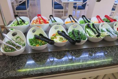 Snídaně: anglická (párky, vejce natvrdo, míchaná vejce, fazole), pečivo, sýry, salámy, zelenina a ovoce (okurky, rajčata, meloun atd.) džemy, kompoty, sezamová pasta, med, venku se každé ráno připravovaly palačinky a omelety. Káva, čaj. Každý den stejné, ale pořád bylo z čeho vybírat.